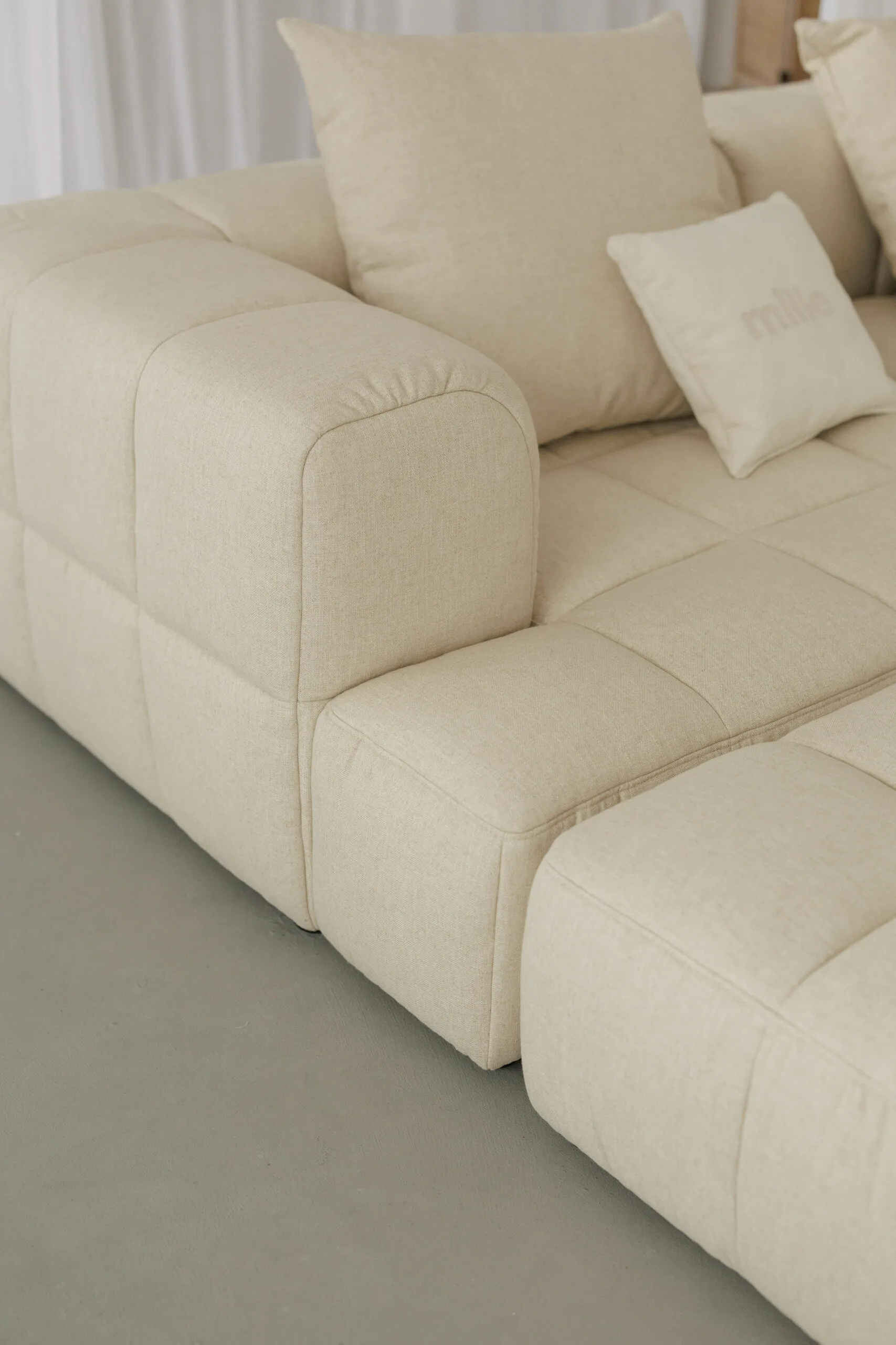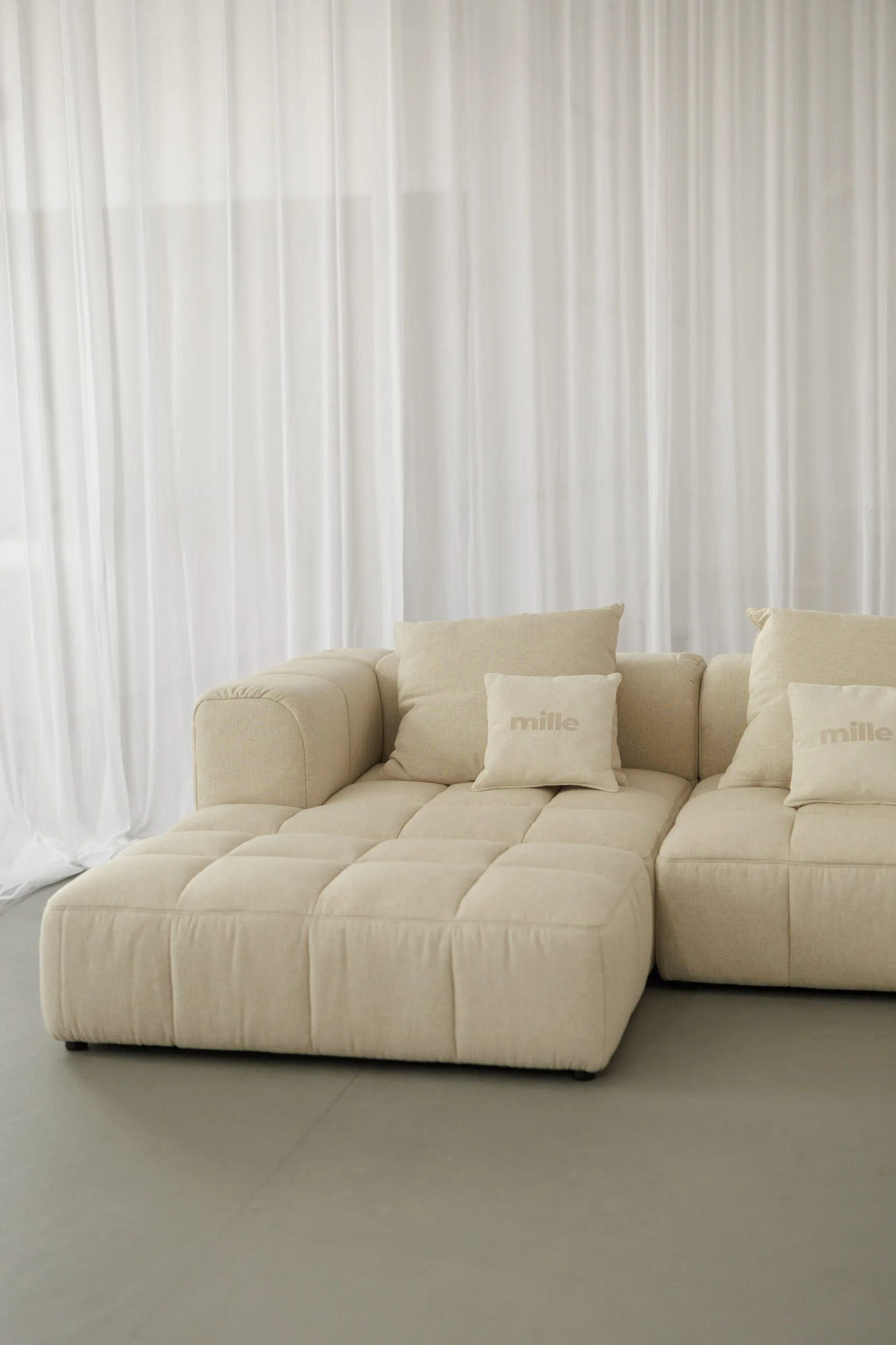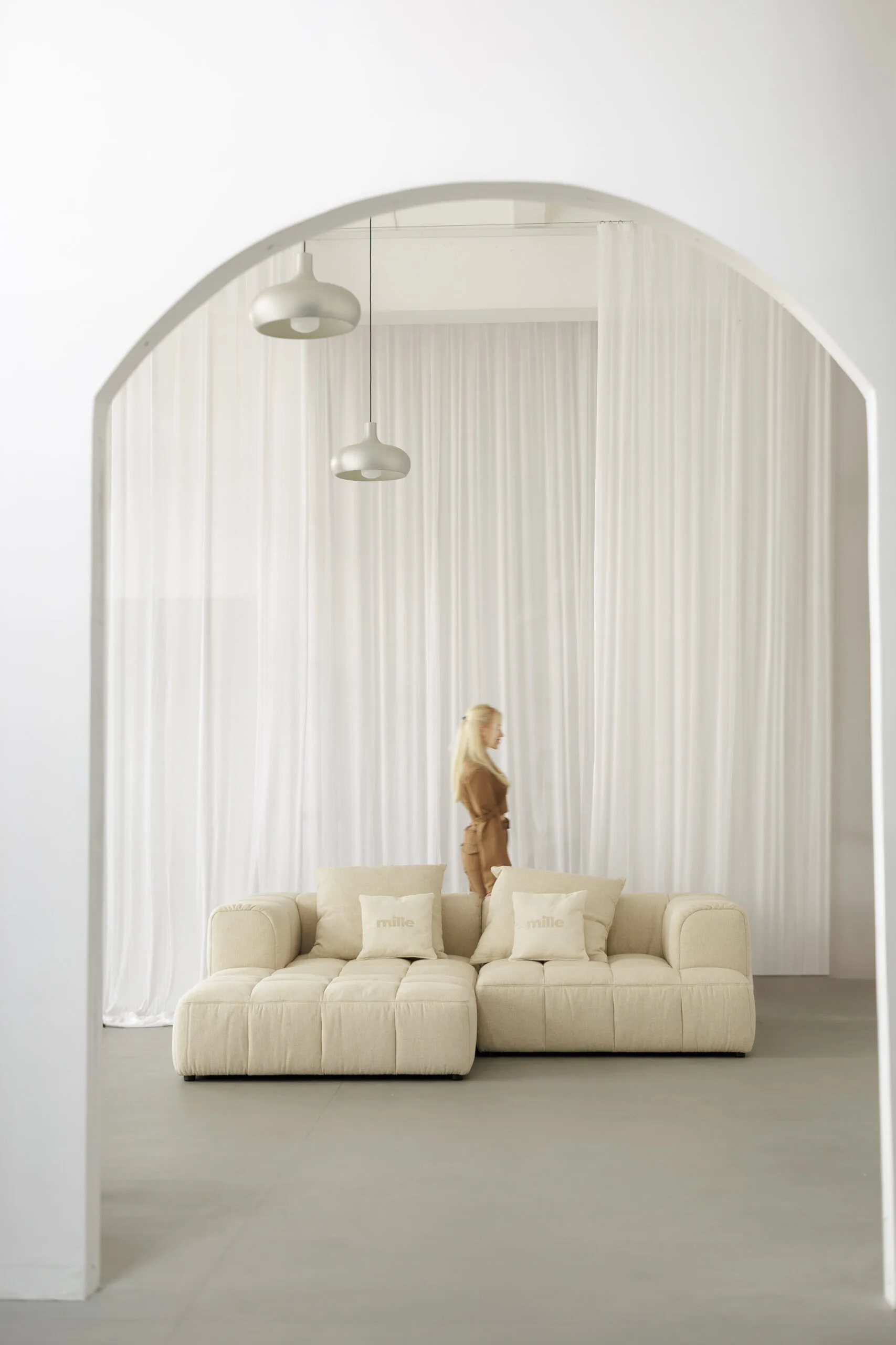Această canapea modulară redefinește confortul cu designul său pufos și liniile sale curate. Tapițeria moale și pernele confortabile oferă un loc ideal pentru relaxare. Stilul său versatil și culoarea neutră o fac perfectă pentru orice living modern.